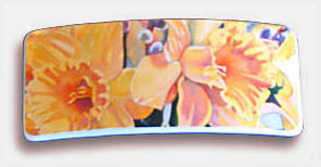 This barette is made with Akins' own image - a reproduced detail of her original watercolor painting, "Still Life with Grape Pitcher". The print is glued to 1/8" thick plastic, then is protected with two coats of clear acrylic and mounted to a sturdy 2.5" long metal barette clip. Size: 3.25" wide x 1.25" high - Price: $19.50 (Code: BFL-998).